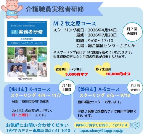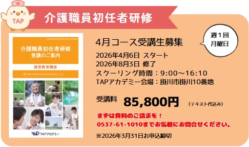 介護に関わるための基本的知識&技術を身につける!お仕事をされている方も安心して学べる週1回コース! ★介護職員初任者研修★ 日程:1月9日~4月24日(金曜日) 期間:約4ヶ月 会場:掛川市掛川10 ※教育訓練給付制度( …