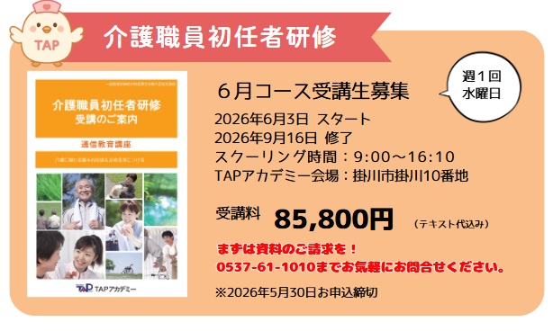 介護に関わるための基本的知識&技術を身につける!お仕事をされている方も安心して学べる週1回コースです。 ★介護職員初任者研修★ 日程:4月6日~8月3日(月曜日) 期間:約4ヶ月 受講料:85,800円⇒65,800円 …