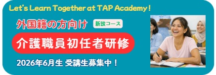 外国籍の同僚の方や、これから介護の仕事を目指しているご友人はいらっしゃいませんか?TAPアカデミーでは、介護の基本はもちろん、日本の介護スタイルについても丁寧にお伝えしています。 慣れない環境や言葉の壁によ …